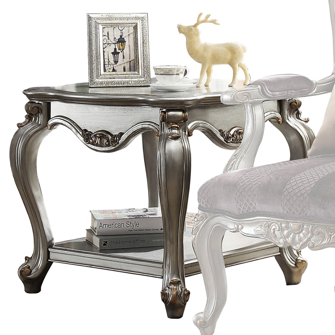 The ACME Furniture Picardy End Table in Antique Platinum showcases intricate carvings and elegant curves. Its ornate design and soft platinum finish add a touch of timeless sophistication. Perfect for complementing living spaces, it blends classic charm with functionality, making it an exquisite accent for any room.Read More