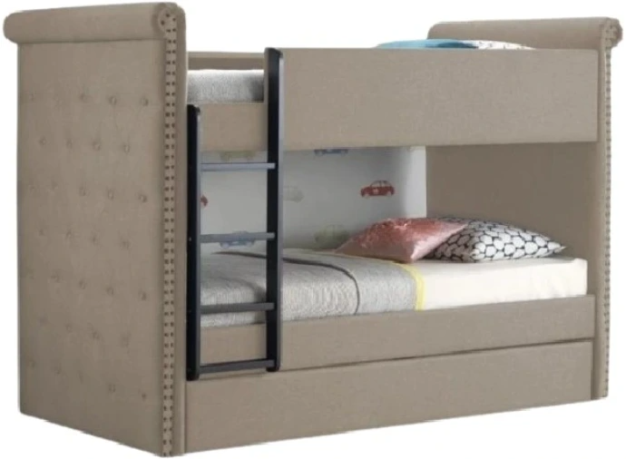 Give your child's bedroom a convenient and stylish update with the Ramona II twin over twin bunk bed. This bed's unique beige fabric has antique-inspired details like button tuft upholstery, and nailhead trim to create a charming and timeless look.Read More