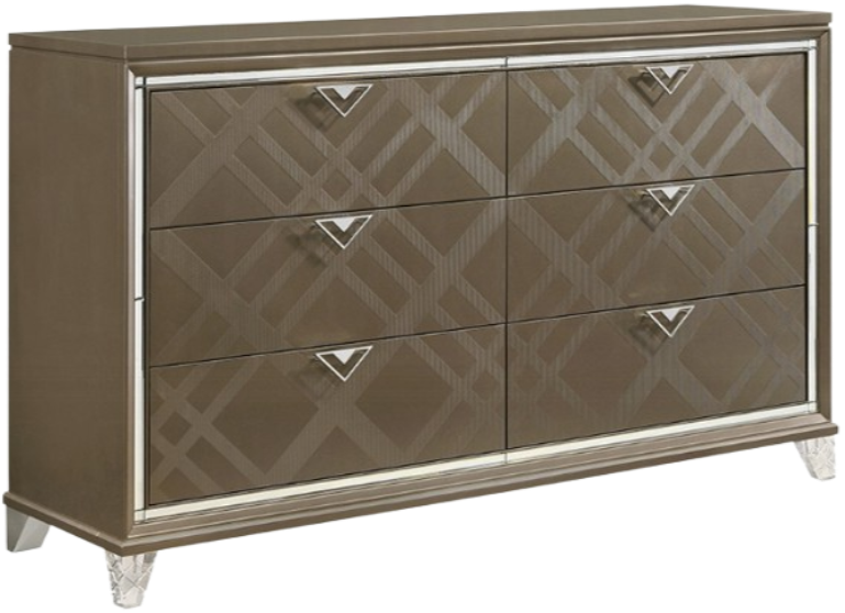 Embossed drawer fronts add incredible richness and detail to this modern glam Sylar dresser with mirrored trim and finished in a trendy dark champagne color. Triangular knobs complement six drawers, which combine with a generous tabletop to offer plenty of space for cosmetics and perfumes.Read More