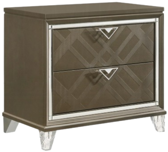 Embossed drawer fronts add incredible richness and detail to this modern glam Sylar nightstand with mirrored trim and finished in a trendy dark champagne color. Triangular knobs complement two drawers, which combine with a generous tabletop to offer plenty of bedside storage.Read More