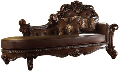 Create an elegant, traditional design in your room with the Vendome Chaise. A hand-crafted piece inspired from the luxurious designs of the past, the beautiful cherry finished bench features a PU cherry button-tufted back with Nailhead trim, two accent pillows, and elaborately detailed carvings on its legs and apron for a truly sophisticated style.Read More