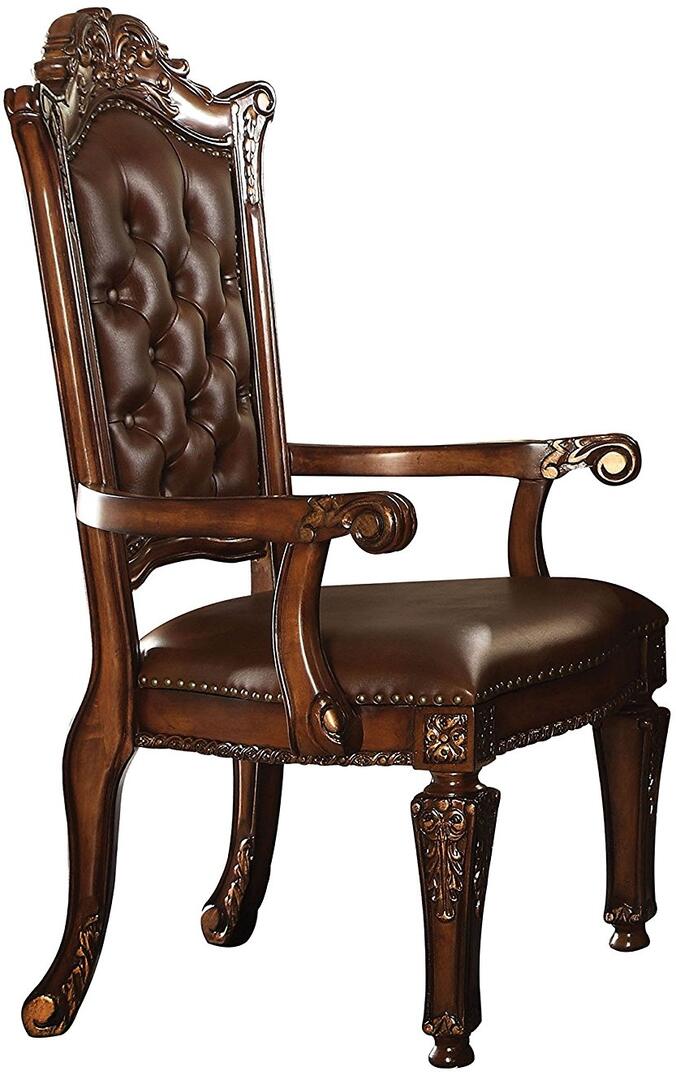 The Vendome executive arm chair classic style will blend masterfully in your home. Carefully constructed from faux leather, selected wood and veneers in rich cherry finish. Highly decorative details, button tufted backrest with nailhead trim, and its decorative moldings are complemented by hand brush accent finish which gives this piece an elegant and sleek appeal.Read More