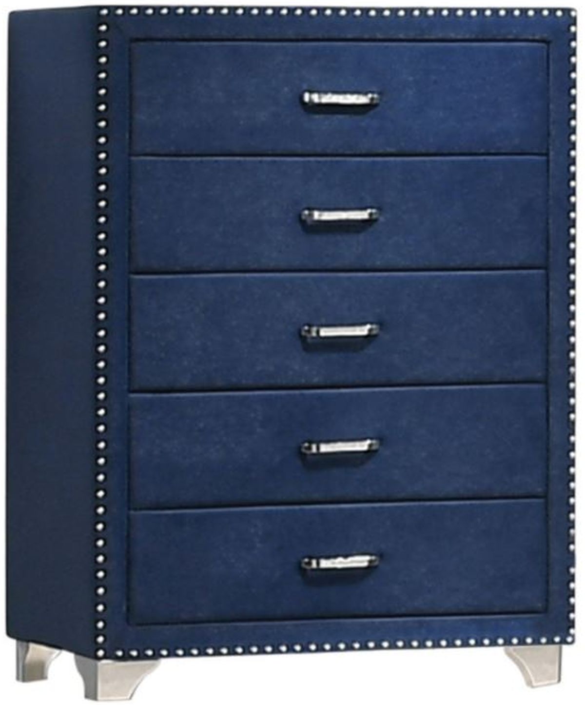 Three cheers for a chest that transforms your sleeping space. A five-drawer chest is readily equipped to store your garments while looking gorgeous. It's uniquely upholstered in velvet fabric for an extra luxurious impression. Nail head trim enhances the appearance while matching the tapered feet. This piece is a bold upgrade while offering a stylish storage solution.