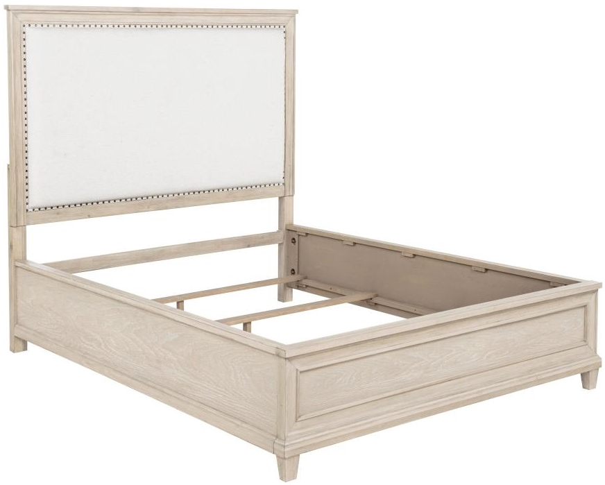 A quiet invitation to rest, this panel bed evokes the calm of coastal mornings and the grace of timeless design. Its tall headboard, wrapped in creamy fabric and framed by washed oak, offers a gentle contrast of texture and tone. A delicate row of nailhead trim glimmers like a finishing touch, while raised panel detailing at the footboard adds poised refinement.Read More