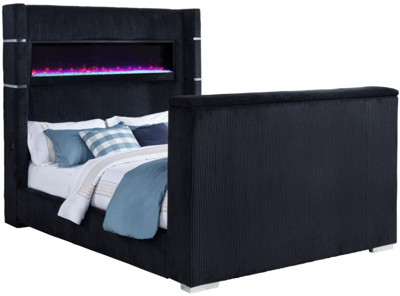 Headboard includes crystal flame visualizer with sixteen color options and no heat output