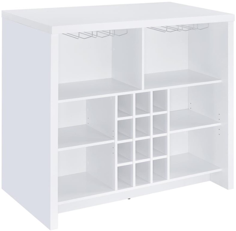 The Coaster® Topanga White Bar Cabinet features spacious storage for bottles, glasses, and bar accessories. Its design includes multiple shelves and drawers, offering organization and convenience for entertaining, making it a functional and stylish addition to any living or dining space.Read More