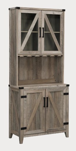 The top of this bar cabinet has two glass doors with two wood shelves to house your favorite wine glasses along with other household essentials that need a home. The bottom cabinet has two bran look wood doors with 2 shelves for any other items you need to store. The open shelf is great to showcase any additional beverage bottle, your favorite decor, coffee station and even a microwave. There are endless possibilities with this unit to maximize your current space, regardless of its size. The grey wash bar cabinet gives ample storage while simultaneously keeping everything contained and out of sight.