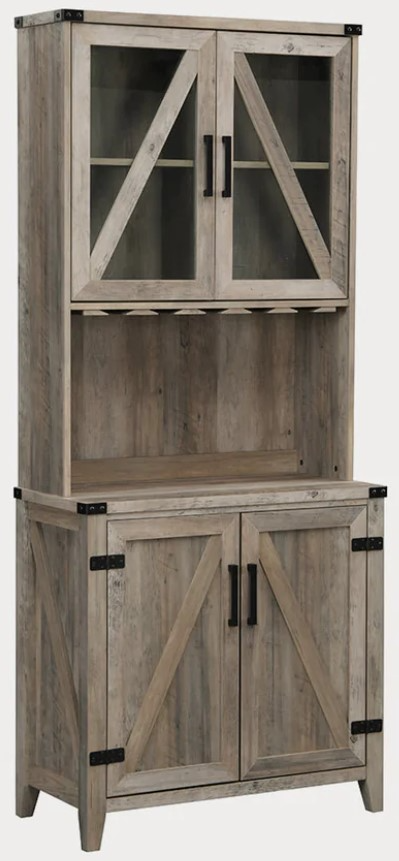 The bottom of the unit has double door cabinetry with knobs on each door, allowing easy access for entry. The top cabinet has two glass doors with two wood shelves to house your favorite wine glasses along with other household essentials that need a home. The bottom cabinet has two bran look wood doors with 2 shelves for any other items you need to store. The open shelf is great to showcase any additional beverage bottle, your favorite decor, coffee station and even a microwave. There are endless possibilities with this unit to maximize your current space, regardless of its size. The grey wash bar cabinet gives ample storage while simultaneously keeping everything contained and out of sight.