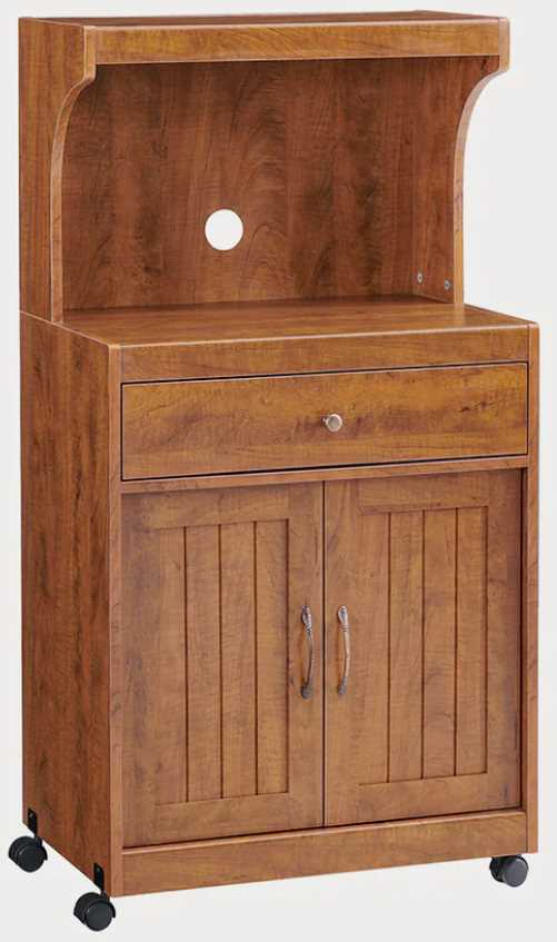 Equipped to provide ample storage and transitional design, the Home Source Microwave Cart is the ultimate acquisition for your small kitchen space. The top shelf offers handy access to cookbooks and savory ingredients. Constructed on casters, the Home Source Oak Microwave Cart is outfitted for total mobility should the need arise. This small kitchen storage wonder is finished in a warm brown cherry laminate and accented with nickel hardware making it the ultimate transitional element in your small kitchen space.