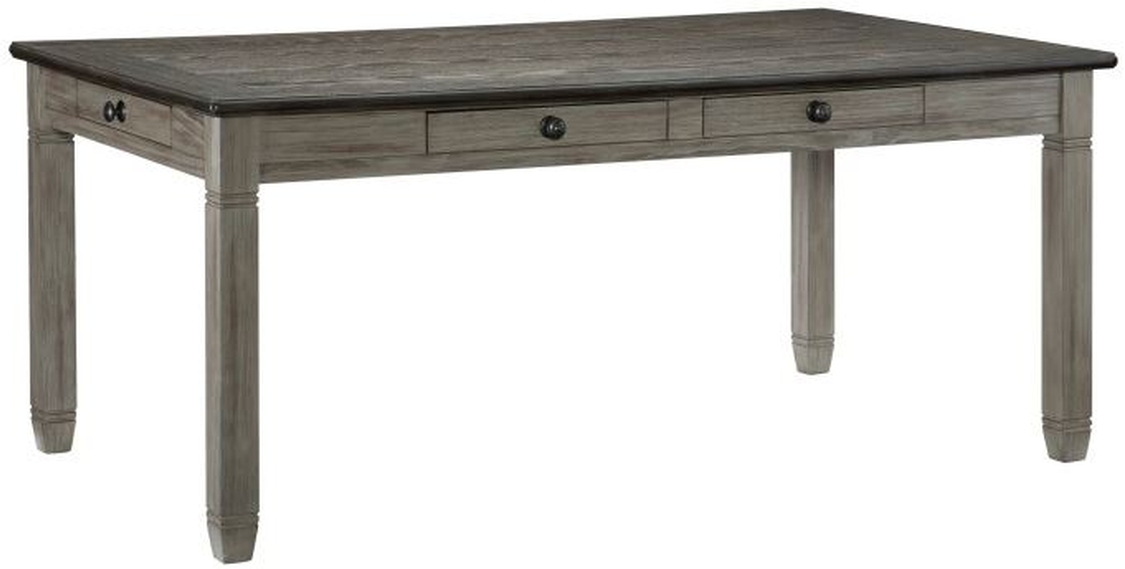 Inspired by the aesthetic of a casual country kitchen, the Granby Collection is an inviting gathering spot for mealtime with family and friends. The 72-inch dining table features 6 drawers on the apron. The two-tone look of the acacia and pine solids base, finished in antique gray, and the oak veneer of the coffee-finished tabletop, present as a harmonious combination of color, perfect for your home. The drawers on the table apron feature dark metal knob hardware.