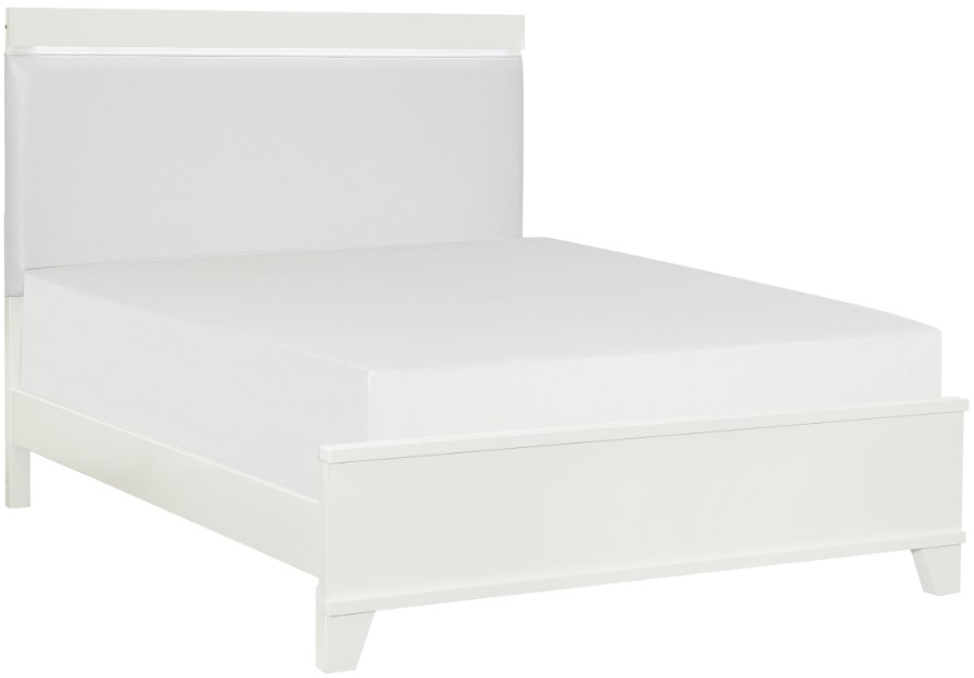 The visually stunning Kerren Collection is a modern study on line and light. LED enhances the top rail of the California King bed. Providing additional eye-catching drama is the white opalescent faux leather headboard, shimmering in the glow of the LED light.Read More
