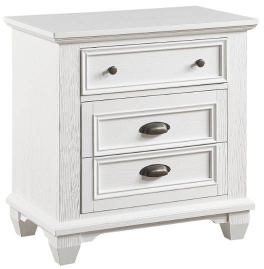 The knob and cup pull hardware of this Mackinac Nightstand features an antique brass finish, providing complementing contrast, and charming accent, to the white finish of the collection.