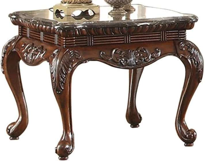 The dark cherry leg finish of the collection serves to highlight not only the traditional style but the marble as well. Coordinating cocktail table and sofa table are also available.
