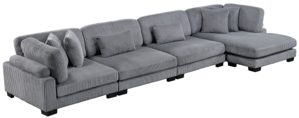 Configurable to your available space, the Traverse Collection allows for the addition and detachment of pieces for a customized seating experience. The 4-piece sectional configuration consists of one corner unit paired with two armless chairs, and a chaise. The gray corduroy fabric upholstery creates a plush expanse for a soft touch experience.Read More