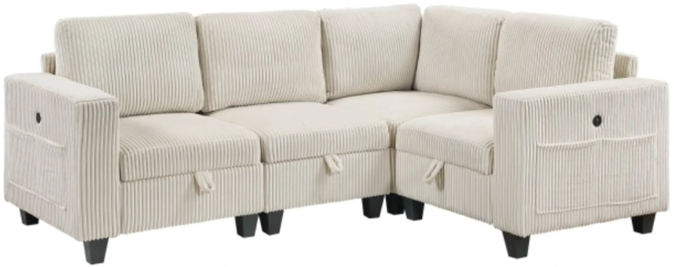 Pull-out storage drawers are neatly tucked beneath the armless chair, and end seats of the sectional, each drawer easily accessible with a pull to the front-mounted loop handle. The corner seating unit of the sectional is anchored by one armless chair while the two end seat’s arms provide side support and power charging ports. The collection is covered in beige corduroy fabric for a neutral complement to your home’s décor.