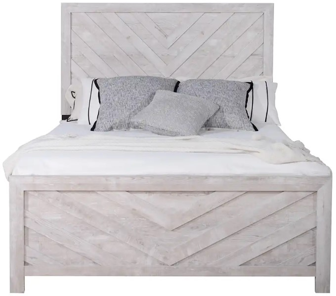 Chevron pattern wood trim on the tall headboard and matching footboard are complemented by the contrasting dark iron finish drawer pulls.