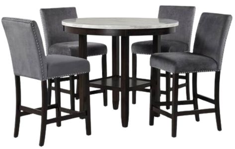 If you prefer counter height, choose from a 42” round table, 42” square table or a 3 person theater bar counter table. These chic tables feature a glossy finish on the tabletop that provides both heat and water resistance, ensuring easy cleaning and protection from wear. The white and gray veined faux marble top, complemented by deep espresso legs, creates a contemporary and glamorous ambiance. Crafted from solid Rubberwood and high-quality manufactured wood components, the Celeste dining collection is designed for longevity. Accenting the table, luxurious seating awaits with the soft and durable 100% polyester velvet fabric covering sumptuous memory foam cushion. Available in black, royal blue and gray, the chairs are tailored for elegance, the rich and luxurious colors of the velvet chairs enhanced by silver nailhead trim, providing a sparkling final touch to this impeccable dining collection. Elevate your dining experience with Celeste a fusion of contemporary glamour and enduring quality.