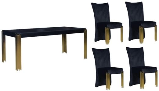 The expertly tailored channel back chairs, paired with gleaming gold layered legs, evoke the allure of a city skyline under the starlit night. Luxurious black polyester velvet fabric covers supportive foam seats, adding both comfort and sophistication. With full-length upholstered chair backs that sweep to the floor, elegance is elevated to new heights. Perfect for intimate gatherings, this fixed top table comfortably accommodates four people.