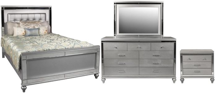 The Valentino bedroom set in silver is an exquisite collection designed to elevate your bedroom into a luxurious sanctuary. This set includes a king bed with touch lighting, a dresser, a lighted mirror, a nightstand, and a chest.Read More